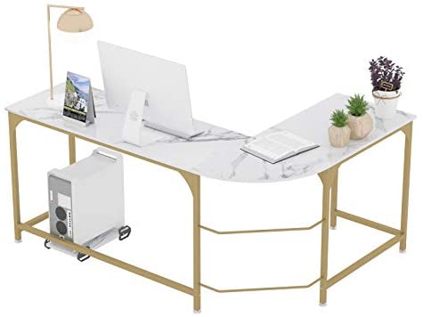 • Teraves Reversible L-Shaped Desk Corner Gaming Computer Desk Office Workstation Modern Home Study Writing Wooden Table (Large, White Marbling+ Gold Frame)