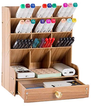 • YCOCO Wooden Desk Organizer,Multi-Functional Desk Pen Holder Organizer,Desktop Stationery Organizer,Home Office Art Supplies Storage Box Rack with Drawer,Brown