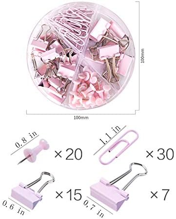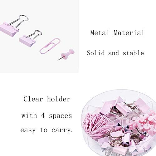 Paper Clips and Binder Clips Push Pins Set and Holder, Syitem Non-Skid Map Tacks Thumbtacks Clips Kits with Container for Office School Home Desk Supplies, 72 PCS Assorted Sizes (Pink)