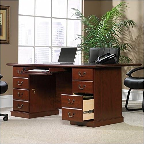 Finish: Classic Cherry, Antique BrassMaterial: Manufactured Wood (Top Quality MDF)Application: Home Office, Professional OfficeKeyboard Tray: YesNon-toxic: YesScratch, Stain & Heat Resistant: YesCable Management: YesThree file drawers with full extension slides hold letter, legal or European size hanging filesTwo file drawers on left side have key lock and center drawer has flip-down front Grommet holes in desk top for cord management