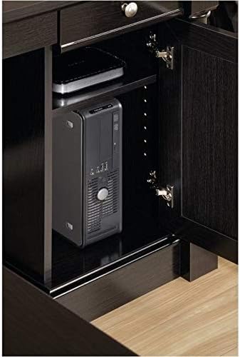 Finish: Wind Oak Materials: Engineered Wood Drawer/shelf features flip-down panel for laptop or keyboard/mouse and can be fastened on the left or right side File drawer with full extension slides holds letter or legal size hanging files Three additional drawers feature metal runners and safety stops Desk top has grommet holes for electrical cord access Storage area behind door holds vertical CPU tower and has an adjustable shelf Finished on all sides for versatile placement Quick and easy assembly with patented T-slot drawer system