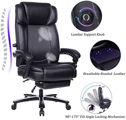 ★ 【FLEXIBLE RECLINING ANGLE AND RECTRACTABLE FOOTREST】 – You can adjust the office chair any way you need to so that it can accommodate all your comfort needs. Built-in adjustable lumbar support with controlled lumbar knob that allows you to increase and decrease the pressure provided to your back. The chair has a locking system that allows you to securely keep the right angle you need to ( 90 to 175 degree ) Also, you can pull out and flip over the footrest as a recliner for napping and more