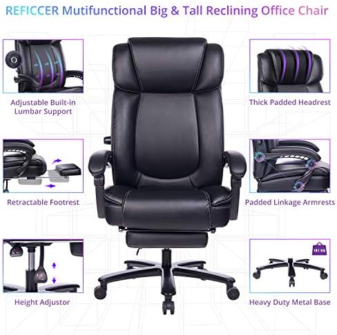 REFICCER Big and Tall Reclining Leather Office Chair – Metal Base High Back Executive Computer Desk Chair with Adjustable Built-in Lumbar Support, Angle Recline Locking System and Footrest, Black