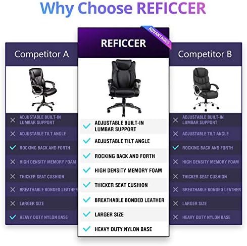 👍ENJOY ULTIMATE COMFORT IN YOUR OFFICE TASKS: with REFFICER executive computer chair. Ergonomically designed with a high back for best lumbar support and a double padded high density foam seat cushion , this high-back executive office chair is made for your comfort