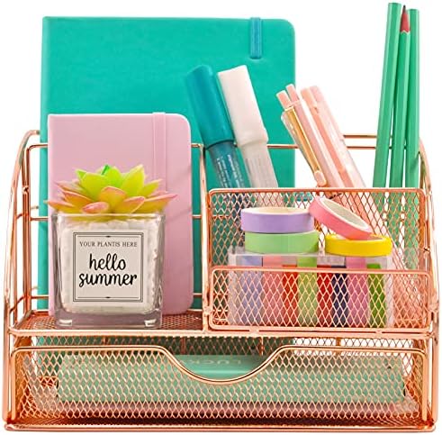 Rose Gold Desk Organizer for Women, COSYAWN All in One Mesh Office Supplies Desk Accessories, Features 5 Compartments + 1 Mini Sliding Drawer