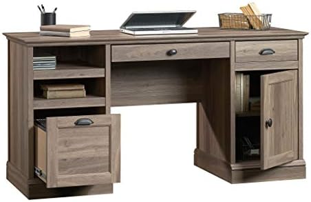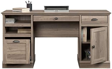 Looking for a little inspiration when it comes to working on your big projects and papers? We’ve got you covered! Find motivation and more When you add beauty and charm to your home office or work space with this executive desk from the barrister lane collection. Its spacious top surface provides you with room for ALL YOUR must-have desk essentials – laptop, cup full of pens, collection of notepads and even a lamp! The Pencil drawer and small storage drawer both open and close on smooth metal runners for easy access storage of miscellaneous office supplies. It also features open storage that includes an adjustable shelf that you can move to different heights to create flexible storage options for items of all sizes. Behind the framed panel door is a hidden storage area that includes an additional adjustable shelf for you to store items that you prefer stay out of sight. Its large file drawer with full extension slides holds letter-size hanging files so you can keep your important papers organized. Finished on all sides in a rustic salt Oak, this executive desk is just what your office needs. Quick and easy assembly with patented T-lock drawer system.
