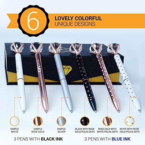 Set of 6 PCS Big Crystal Diamond Pens in Gift Box – Rose Gold Silver White Fancy Cute Fun Bling Top Ballpoint Writing Pen, Blue & Black Ink – Bulk School Desk Office Supplies for Women Girls Coworkers