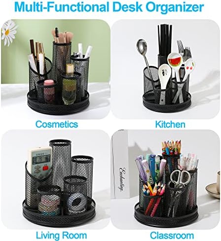 SONKERG Pen Holder for Desk Cute, 360° Rotating 5 Grid Pen Holder, Home Office Pencil Cup, Multi-Functional Mesh Desk Organizer, Black