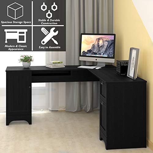 Tangkula 66.5” ×66.5” L-Shaped Desk, Modern Corner Computer Table with Drawers and Adjustable Shelf, Study Writing Table Workstation for Home Office (Black)