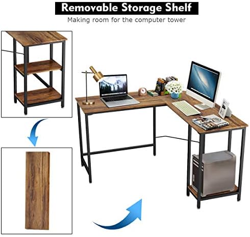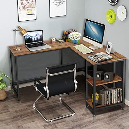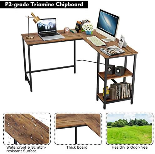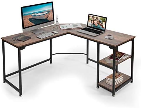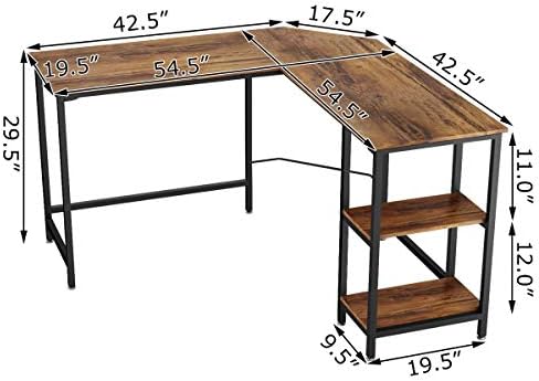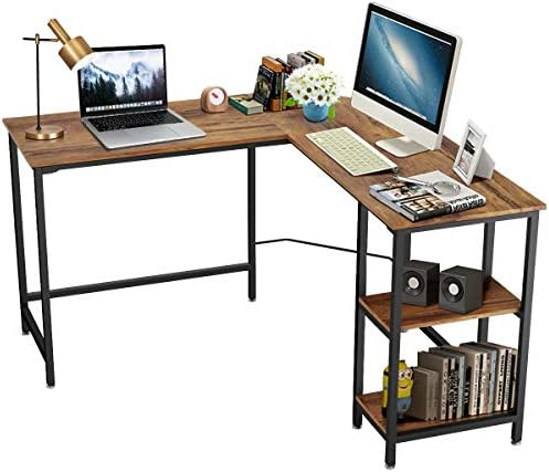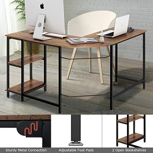 L-shape desk to fit to any corner of your home, maximizing space savingsMade of engineered wood and metal frame to ensure sturdiness and durability Multifunctional classified area for working and relaxing use2 open bookshelves to provide large storage spaceProvides ample legroom for stretching your legs freelyMax weight capacity can reach 110 lbsWidely used as computer desk, office desk and gaming tableSmooth surface for easy cleaningAdjustable foot pads to keep stable on uneven floor