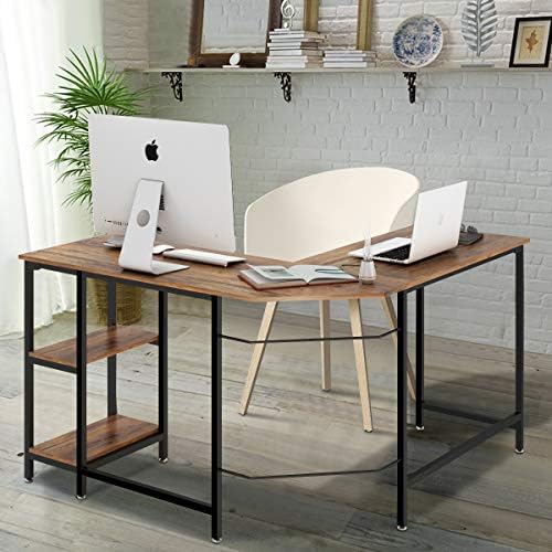 Tangkula Industrial L-Shaped Computer Desk, Space-Saving Corner Desk with Storage Bookshelves & Adjustable Foot Pads, Home Office Desk Study Workstation for Home Office (Walnut)