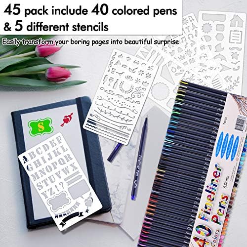 Tebik 45 Pack Journal Planner Pens Colored Pens, 40 Assorted Colors Drawing Pens with 5 Different Stencils, Perfect for Dotted Journal Planner Writing Note Calendar Coloring Office School Supplies