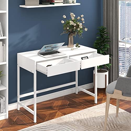Treocho Computer Desk 39.4″ Study Writing Table for Home Office, Modern Simple Style PC Desk, White Metal Frame