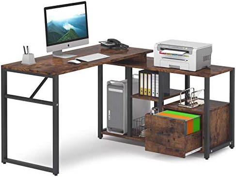 Price: (as of – Details) Product Description Tribesigns Vintage Industrial L-Shaped Office Desk with Letter Size File Drawer and Storage Shelves for Home Office Specifications: -Material: E1 Particle Board + Metal Frame -Color: Brown+Black -Overall Size: 47″(L) x 39.3″(W) x 29.5”(H) -Rotating Desktop: 47”(L) x 19.7”(W) -Drawer Size: 13″(W) x 13(D) x 10.6″(H) -Weight: 72.8lbs