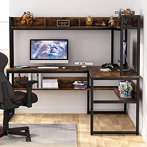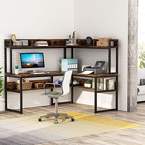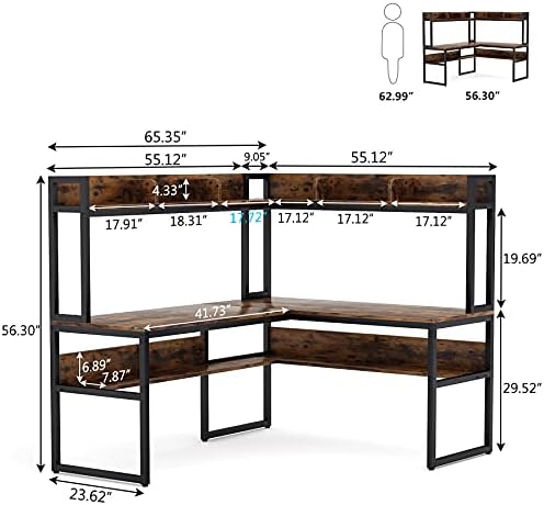 Price: (as of – Details) Product Description Specifications: Safe Material: E1 class particle board + Black Metal Frame Desktop Thicken Board: 0.59″ Item Weight: 88.18 lb. Desk Dimension: 65.35’’(L)*55.12’’(W)*56.30’’(H) Color: Rustic Brown Tip for customer: Please ensure you receive Two package before assembly Tribesigns L-Shaped Computer Desk with Hutch & Storage Shelves, 65 inch Industrial