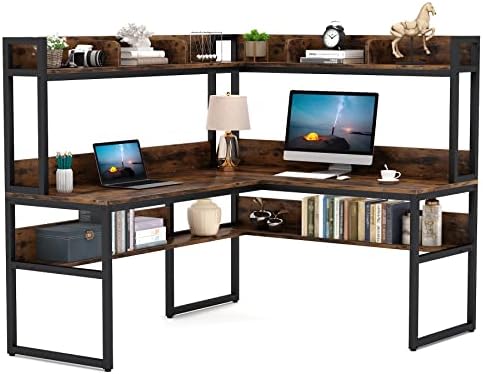 Tribesigns L-Shaped Computer Desk with Hutch & Storage Shelves, 65 inch Industrial Double Corner Office Desk Study Workstation for Home Office, Rustic Brown