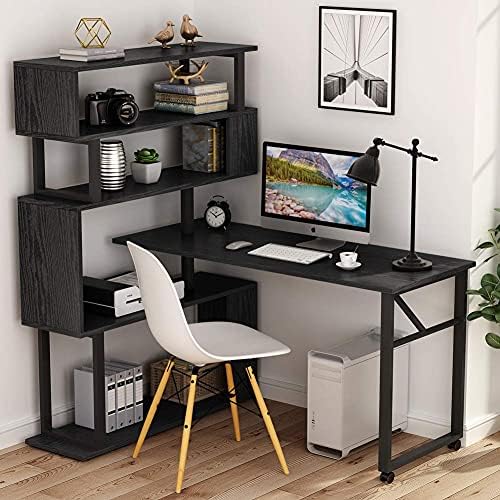 Tribesigns Rotating Computer Desk with 5 Shelves Bookshelf, Modern L-Shaped Corner Desk with Storage, Reversible Office Desk Study Table Writing Desk with Wheels for Home Office (Black)