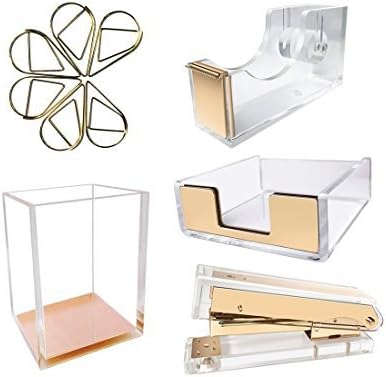 UNIQOOO 5 Count Super Thick Clear Acrylic Gold Finish Stationery Set – Desk Stapler, Pen Holder, Tape Dispenser, Memo Case, Paper Clips- Great for Modern Office, Arts Lover, Calligrapher, Great Gift