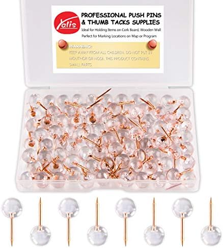 Package included: 100 count rose gold point clear map pins in a case. <br>These clear push pins crafted by YALIS provide excellent assistance in pinning your important papers and messages while keeping you organized.